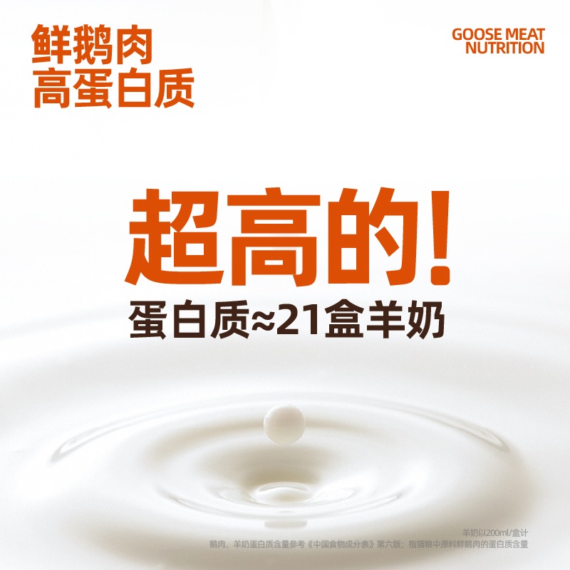 1、配方特别添加鹅胸肉,鹅胸肉本身蛋白质的含量就高(每100g鹅胸肉含有85.98g蛋白质),是100g去皮鸡肉的3倍,而鹅肉又是WHO(世界卫生组织)发布的“健康食品排行榜”中肉类第一位,属于高蛋白、低胆固醇、低脂肪的健康食品,更有多种维生素、烟酸、钙、钾等营养源自鹅肉本身。 2、实力猫粮原料指标,粗蛋白质领先于AFFCO标准 成猫动物性原料88.5% ,粗蛋白≥42% 幼猫动物性原料90% ,粗蛋白≥42% 3、双料冻干,打开挑嘴猫咪食欲,补充鹅肉生骨肉营养 成猫:7% 主食级营养生骨肉冻干+ 4%鸡肉松冻干 幼猫:5% 主食级营养生骨肉冻干+ 4%鸡肉松冻干 4、针对猫咪不同阶段定制化的专属功能 成猫专注肾脏健康:特添① L-精氨酸-护肾营养素②维生素C&维生素E-肾脏“保护盾”组合成分③蔓越莓、茯苓、车前子-呵护泌尿系统 幼猫补充关键发育营养:特添①羊初乳-丰富免疫球蛋白,维持肠道“自护力”②乳铁蛋白-巩固幼猫健康根基 ③FOS益生元&GOS益生元-助力幼猫营养吸收.
